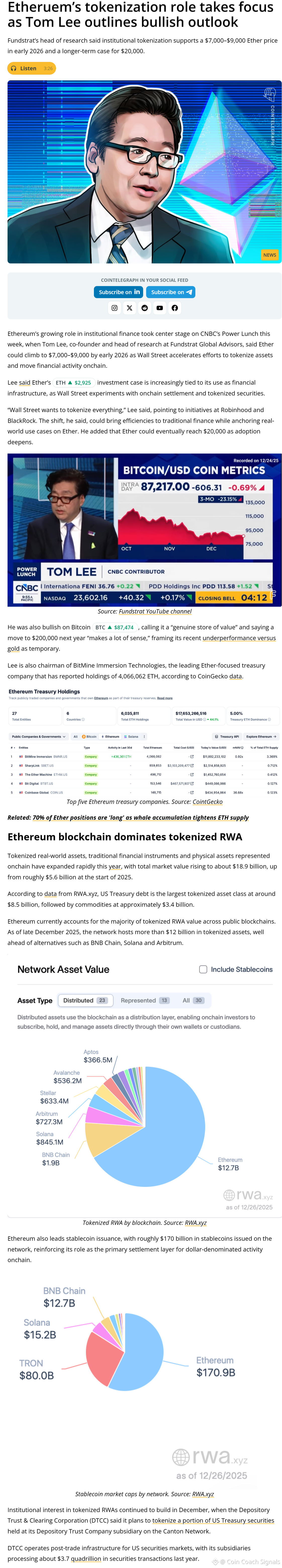 One of the clearest summaries of this shift recently came from Tom Lee, who has been increasingly vocal about Ethereum’s role in tokenization and institutional finance. His argument isn’t built on hype or trend chasing. It’s grounded in the idea that Ethereum is becoming financial infrastructure, and that changes how Ether itself should be valued.
