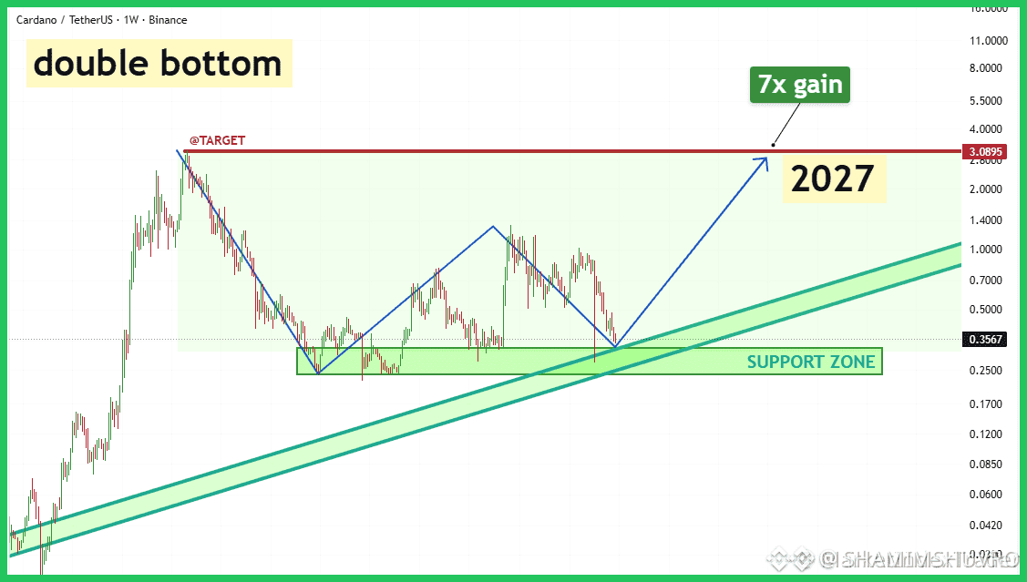 We are analyzing the Weekly chart, which clearly identifies a macro double bottom pattern. This highly bullish reversal structure found crucial support in the $0.25 to $0.30 range (the 'SUPPORT ZONE'), coinciding perfectly with the multi-year ascending trendline. The current price ($0.3567) offers a fantastic entry near the base. Breaking through the neckline will confirm the continuation toward the previous all-time high zone. The ultimate long-term target is marked at $3.0895, representing a potential 7x gain over the next few years.