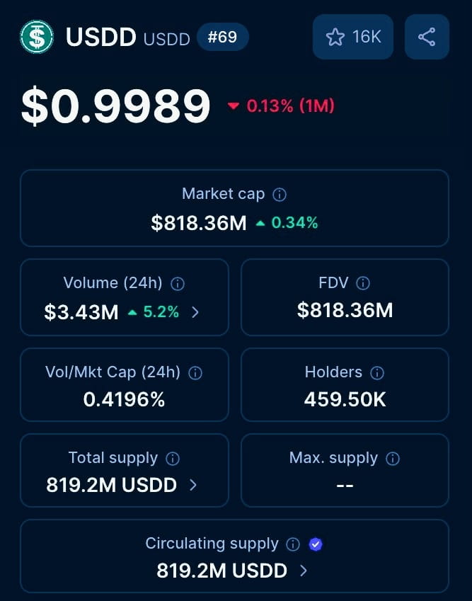 Was noch interessanter ist, ist der Ripple-Effekt. Der Vorstoß von Binance hat die USD1-Emission massiv beschleunigt, und wenn man auf USDD zoomt, werden die Zahlen ziemlich wild. USDD – TRONs führendes dezentrales Stablecoin, hat Anfang dieses Jahres einen ruhigen Identitätswechsel durchgemacht und sich von dem alten Algo-Modell in ein konservativeres, überbesichertes Setup bewegt. Weniger Drama, mehr Stabilität.
