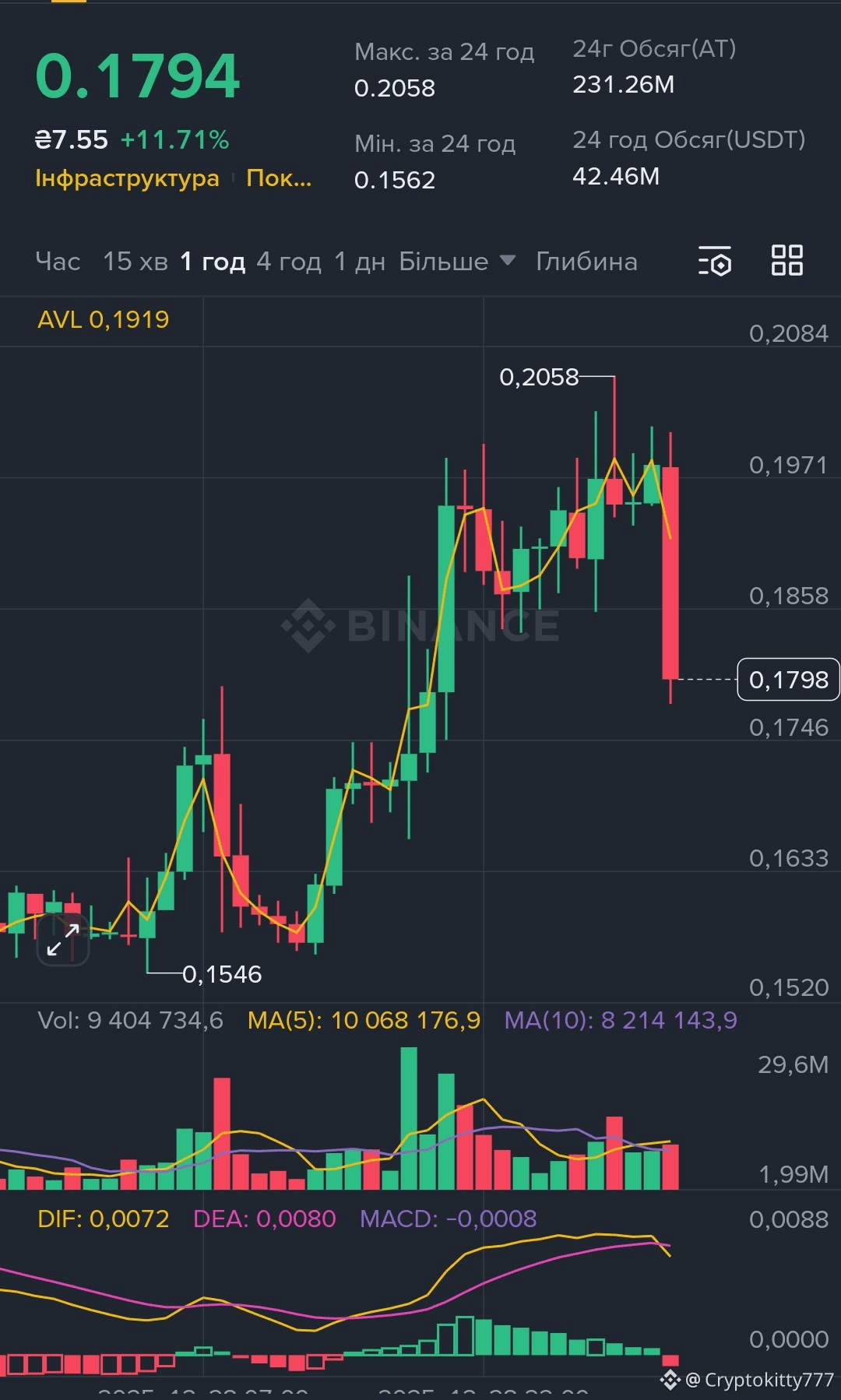 При этом рынок сегодня показал вполне ожидаемую реакцию — резкую коррекционную свечу на часовых графиках. Это выглядит не как паника, а как нормальная фиксация прибыли и «остывание» после быстрого движения. Объёмы остаются заметными, а ключевая зона поддержки пока держится в районе 0.1700–0.1750. Если цена останется выше этих уровней, сценарий с продолжением восстановления останется актуальным. Более глубокое падение будет означать, что импульс, возможно, выдыхается.