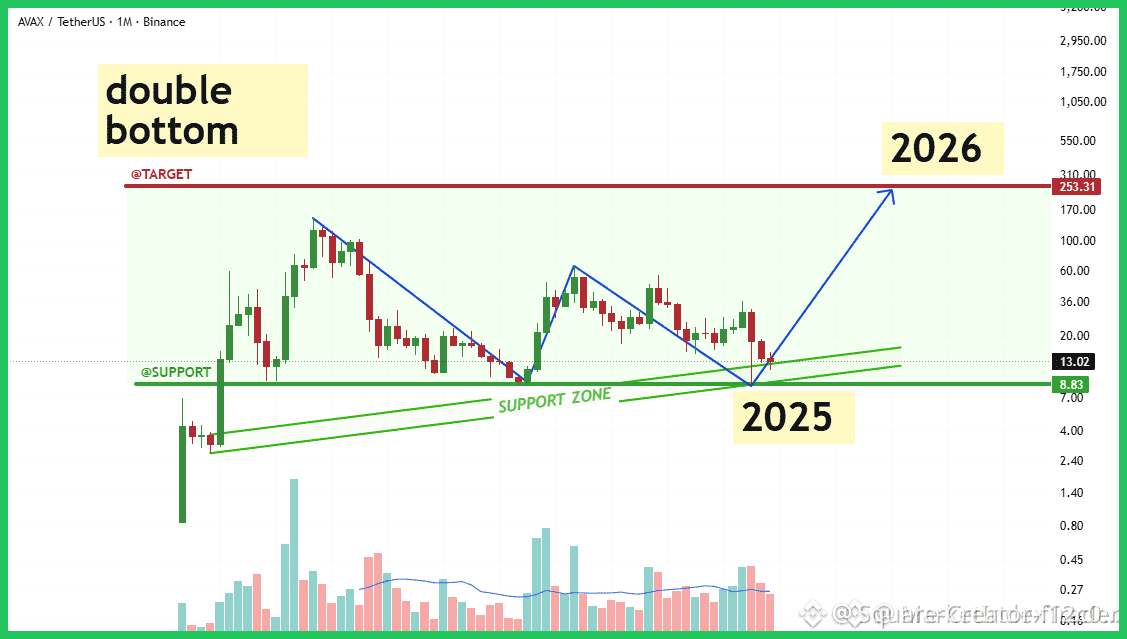 يكشف الرسم البياني الشهري عن نمط انعكاسي واضح لقاع مزدوج يتجلى عبر الدورة الحالية، مما يدل عادةً على تراكم مؤسسي قبل توسع كبير. منطقة الدعم الحرجة محددة بدقة بين $8.83 و $13.02. طالما أن AVAX يحتفظ بهذا المستوى، فإن الهيكل الصاعد يبقى سليمًا.