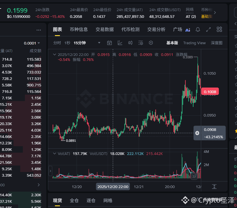 市场情绪也跟着彻底“妖”化。 现在大家都不聊它跌得多惨了,全在传“逆袭神话”。跌得越狠,反弹越凶——这种故事在币圈永远有市场。AT 瞬间从“弃儿”变“骄子”,成了很多人眼里“高确定性”的抄底标的。仿佛不买它就错过了一个亿,FOMO情绪开始暗流涌动。