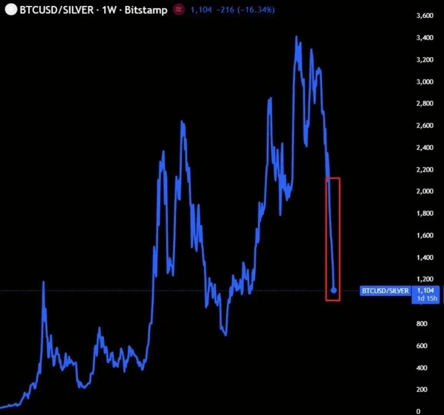 Der drastische Rückgang dieser beiden Schlüsselverhältnisse ist kein Zufall. Seit Mai 2025 ist das Bitcoin/Silber-Verhältnis um 67% gefallen; seit Januar dieses Jahres ist das Bitcoin/Gold-Verhältnis um 50% gefallen.