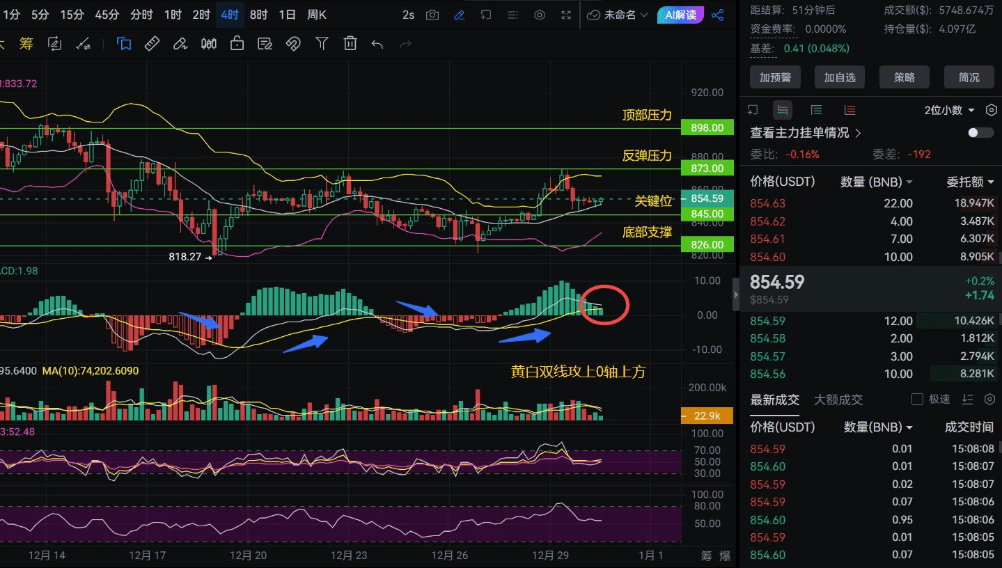 In den schwankenden K-Linien verbirgt sich ein von den meisten Menschen übersehener Schlüsselindikator. Wenn du dir die 4-Stunden-K-Linie von BNB anschaust, denkst du nicht auch, dass es sehr verwirrend ist? Der Preis schwankt klar um 854,59, kommt nicht hoch und nicht runter. Viele Menschen zögern zwischen dem Widerstand bei 873 und der Unterstützung bei 826.