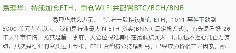 Schau dir die neuesten Entwicklungen von Yi Li Hua an. Diese Person hat öffentlich erklärt: "Ich kaufe weiterhin ETH, investiere stark in WLFI und lege BTC/BCH/BNB an." Beachte die letzten drei Buchstaben BNB.