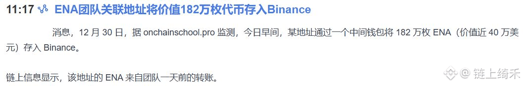 开头先泼盆冷水: 兄弟们,刚才刷到一条快讯,把我瞌睡都吓醒了。ENA团队关联的地址,今天早上通过中间钱包,偷偷摸摸往币安塞了182万个ENA,价值接近40万美金! 这消息就像你正吃着火锅唱着歌,突然听说厨子准备关火跑路,心里能不咯噔一下?
