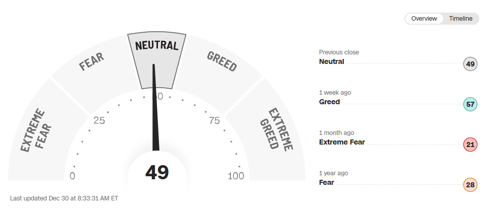 Der Fear & Greed Index ist eine Zusammenstellung von sieben verschiedenen Indikatoren, die einen Aspekt des Verhaltens des Aktienmarktes messen. Diese sind Markt-Momentum, Aktienkursstärke, Aktienkursbreite, Put- und Call-Optionen, Nachfrage nach Junk Bonds, Marktvolatilität und Nachfrage nach sicheren Häfen. Der Index verfolgt, wie stark diese einzelnen Indikatoren von ihren Durchschnitten abweichen im Vergleich dazu, wie stark sie normalerweise divergieren. Der Index gewichtet jeden Indikator gleichmäßig bei der Berechnung eines Scores von 0 bis 100, wobei 100 maximale Gier und 0 maximale Angst repräsentiert.