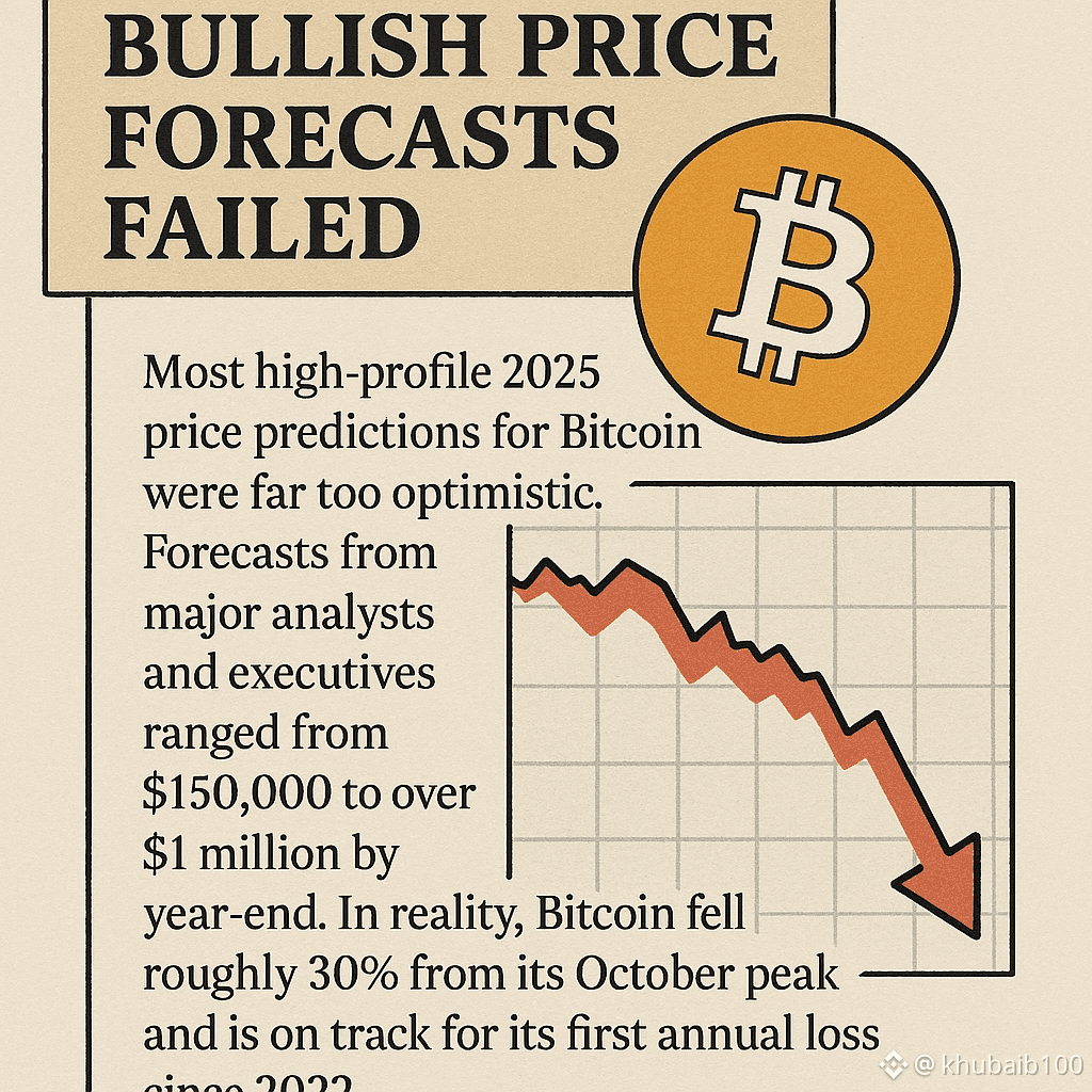 $BTC Most high-profile 2025 price predictions for $BTC Bitcoin were far too optimistic.Forecasts from major analysts and executives ranged from $150,000 to over $1 million by year-end. In reality, Bitcoin fell roughly 30% from its October peak and is on track for its first annual loss since 2022.