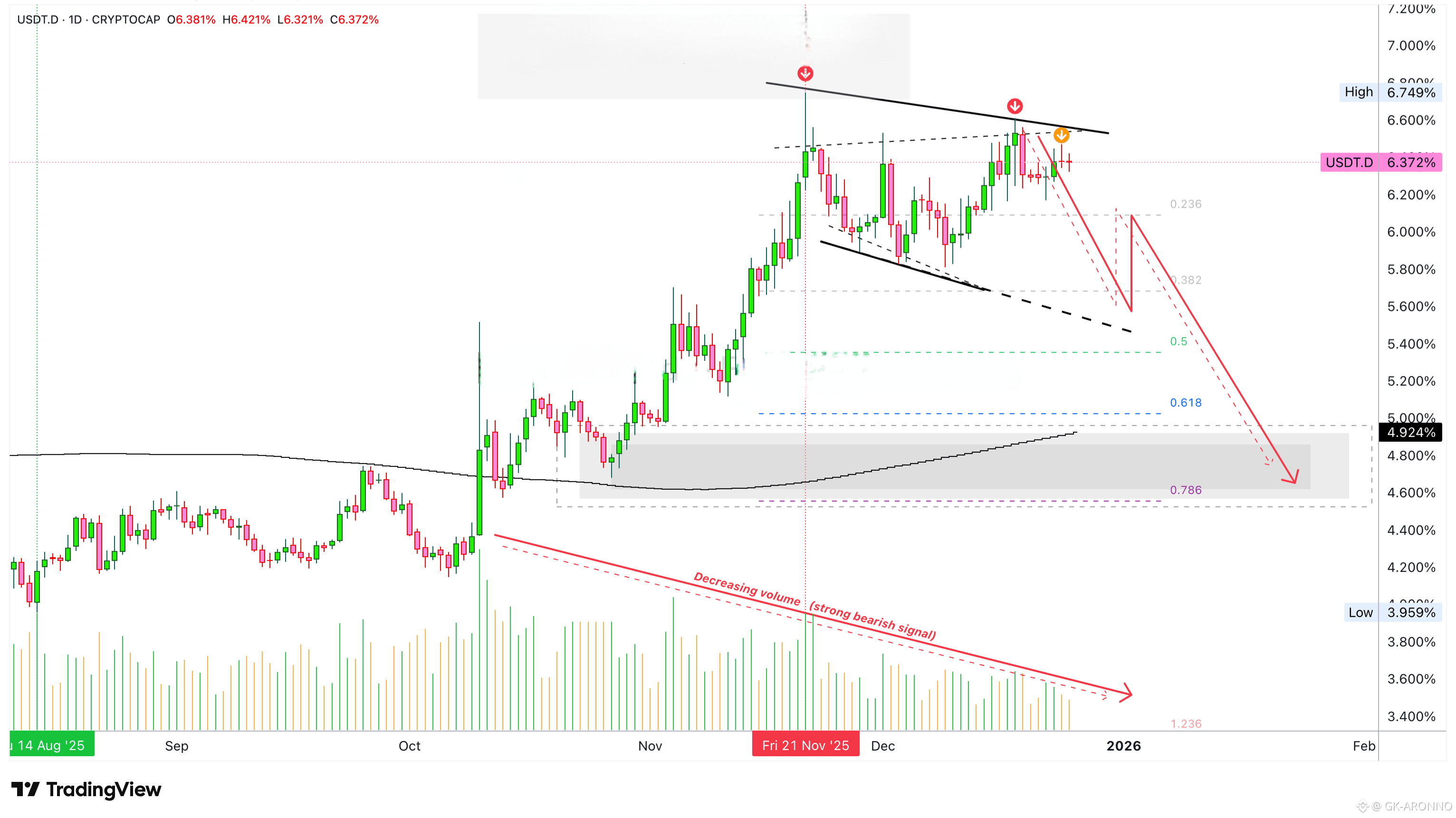 Die Tether-Dominanz handelt nahe ihrem höchsten Punkt seit August 2024. Diese Widerstandszone wurde mehrfach bestĂ€tigt. Ausgehend von einem bedeutenden Hoch, bestĂ€tigtem Widerstand, sind die Wahrscheinlichkeiten eines groĂen RĂŒckgangs einfach zu hoch.