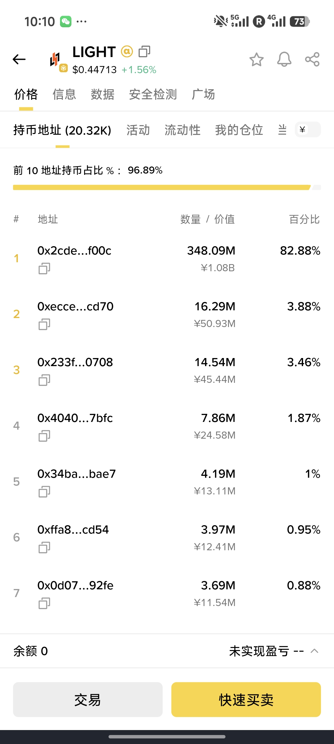 Das Gesamtvolumen von Bitlight beträgt 420 Millionen Token, wobei nur 43,057 Millionen Token im Umlauf sind. Die ersten 10 Adressen halten jedoch 96,89 % davon. Mit anderen Worten: Fast 99 % der Transaktionen werden von diesen wenigen Adressen dominiert. Diese extreme Konzentration der Anteile macht Bitlight zu einem Spiel für wenige.