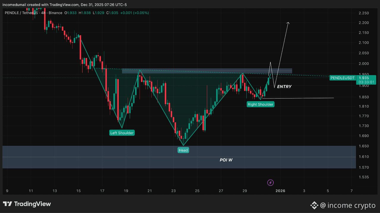 PENDLE bildet ein sauberes 4H inverse Kopf- und Schultermuster, das auf eine potenzielle TrendĂ€nderung nach einem starken AbwĂ€rtstrend hinweist. Der Preis ist bereits von einer wöchentlichen Nachfrage (POI) abgeprallt und drĂŒckt jetzt gegen die Nackenlinie um 1,94â1,96, eine SchlĂŒsselentscheidungszone.