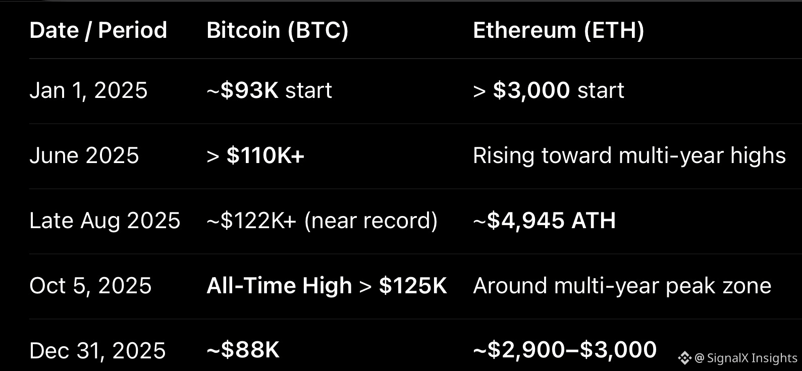 📌 2025 Key Price Milestones — BTC & ETH