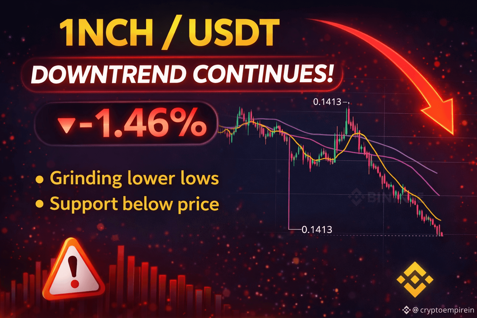 $1INCH is currently trading around $0.1413, down -1.46% on the day. The chart shows a consistent downward structure with lower highs & lower lows, indicating bears still in control.
