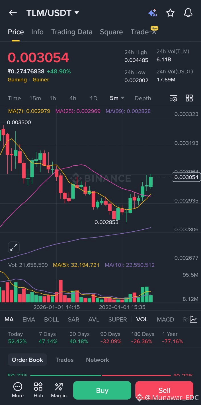 Based on the chart you shared for $TLM on the 5-minute timeframe, the price is currently showing signs of a short-term recovery after a period of downward pressure.