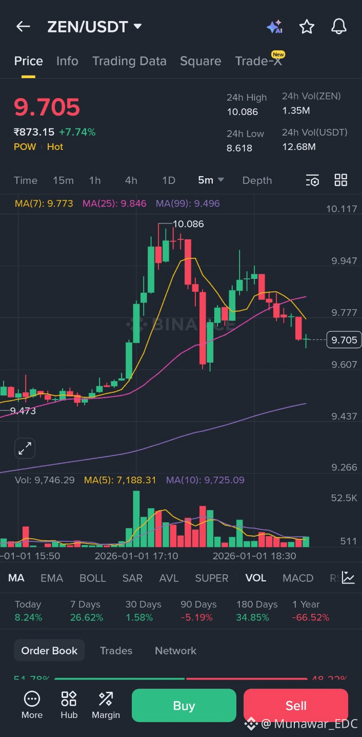 Based on the chart you shared for $ZEN/USDT, here is a breakdown of what the current technical indicators are suggesting.