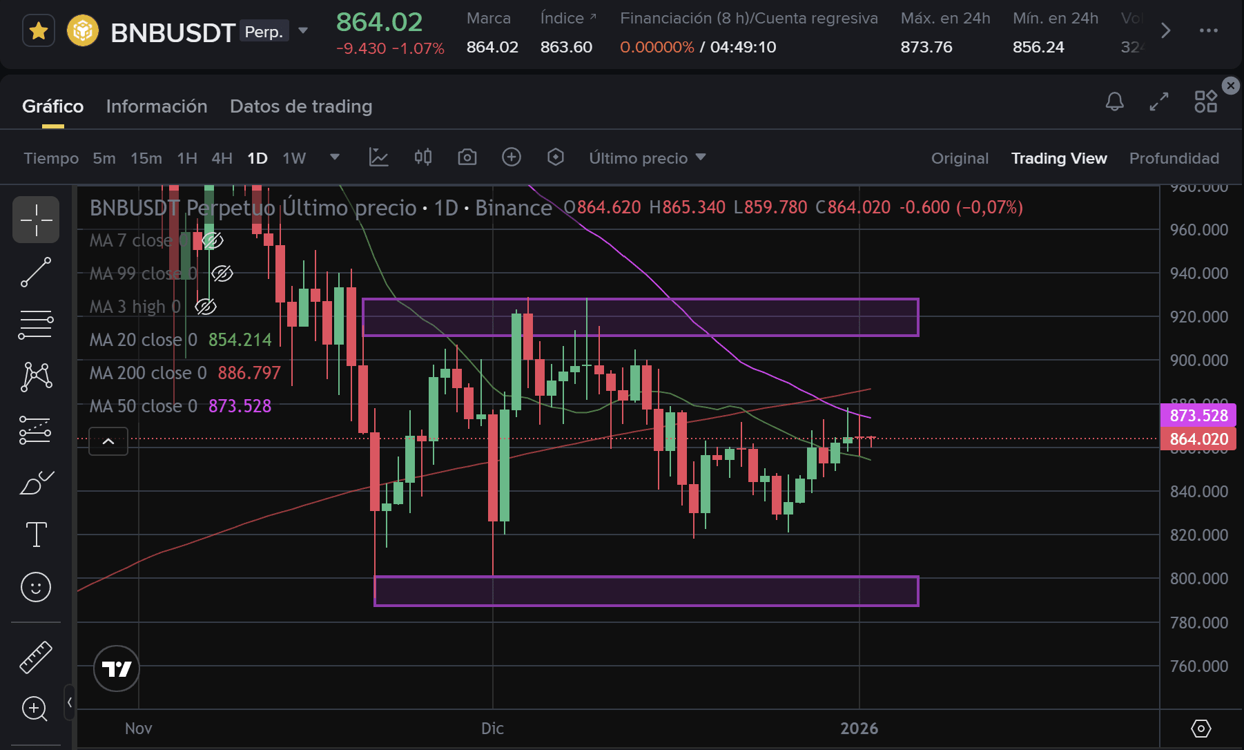 Um einen echten Anstieg zu bestätigen, muss BNB eine tägliche Kerze über $874 (MA 50). Wenn der Hype des Hard Fork ins Spiel kommt, wäre das unmittelbare Ziel, den höheren Widerstand von $886 - $890 (MA 200). Das Durchbrechen dieses Niveaus würde uns auf den Weg zu neuen Höchstständen bringen.🐻 Bärisches Szenario: