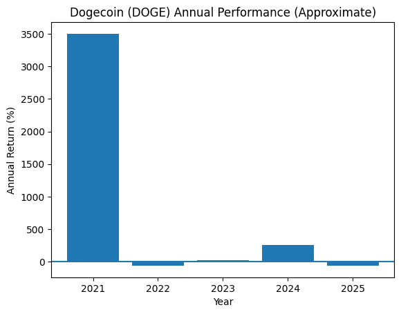 Dogecoin (DOGE) has shown extreme volatility over the past few years, moving through strong rallies and deep corrections. Below is a factual year-by-year overview based on historical price data.