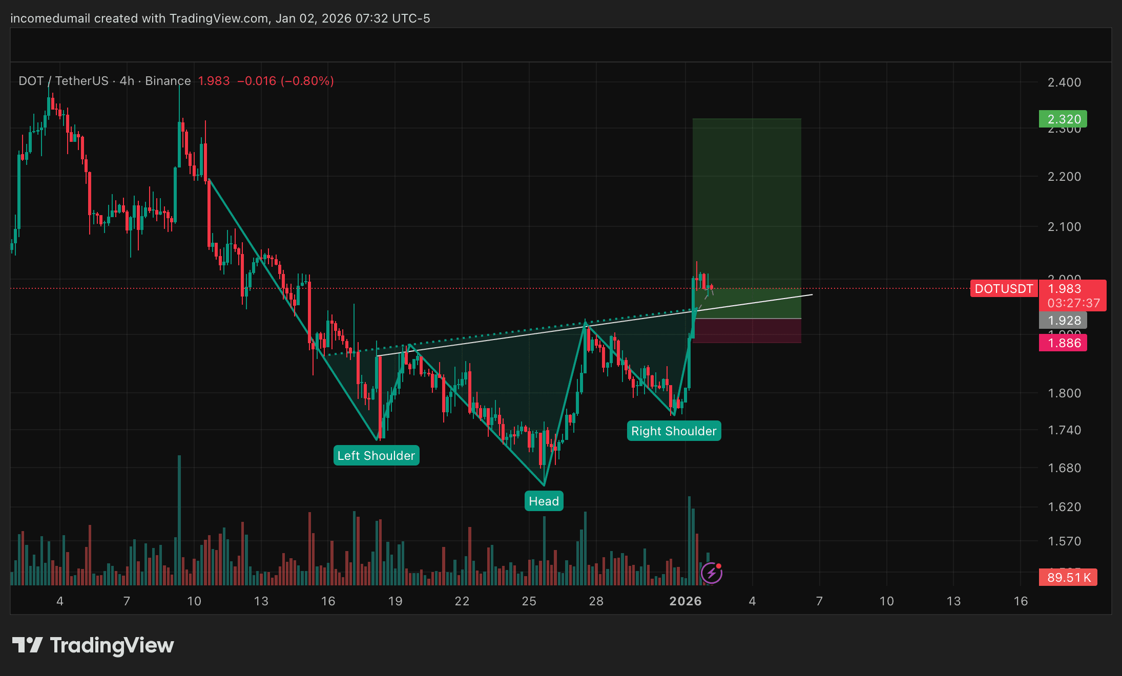 DOT hat ein sauberes inverses Kopf- und Schultermuster im 4H-Zeitrahmen gebildet, was typischerweise einen Trendwechsel nach einem prolongeden Abwärtstrend signalisiert. Die linke Schulter und der Kopf zeigen eine Erschöpfung der Verkäufer, während die rechte Schulter höhere Tiefs und eine verbesserte Käuferstärke bestätigt. Der Preis hat jetzt die Nackenlinie um 1.95–2.00 zurückerobert und in kurzfristige Unterstützung umgewandelt.