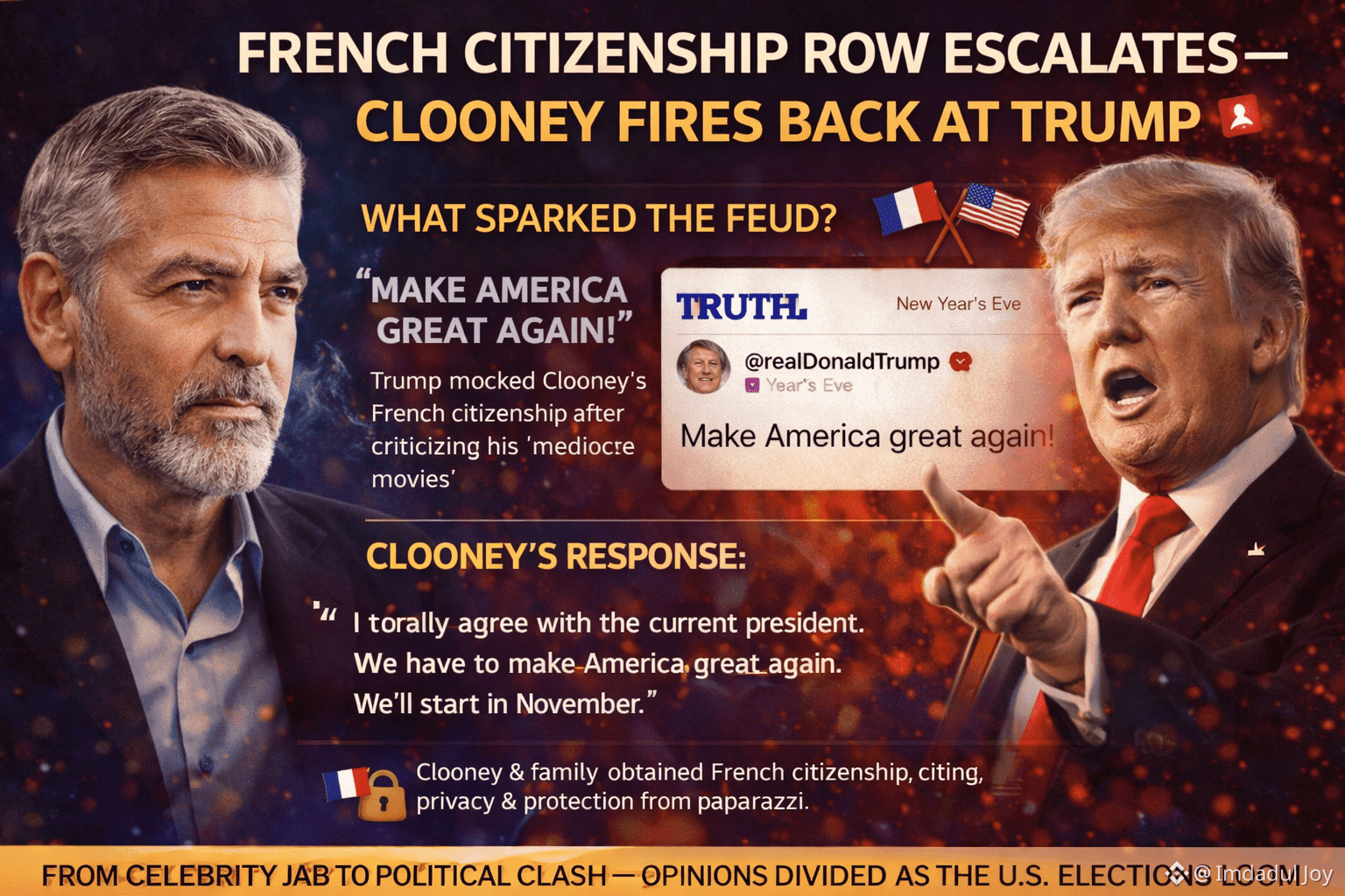 đ«đ·đșđž DER STREIT UM DIE FRANZĂSISCHE STAATSANGEHĂRIGKEIT ESCALTIERT â CLOONEY SCHLĂGT ZURĂCK GEGEN TRUMP Diese Interaktion ist ein klassisches Beispiel dafĂŒr, wie sich der moderne politische Diskurs von politischen Debatten zu hochkarĂ€tigen kulturellen Konflikten gewandelt hat. Auch wenn es auf den ersten Blick wie "harmloser Scherz" aussieht, deuten der Zeitpunkt und der Kontext darauf hin, dass es sich um kalkulierte politische Positionierung auf beiden Seiten handelt.