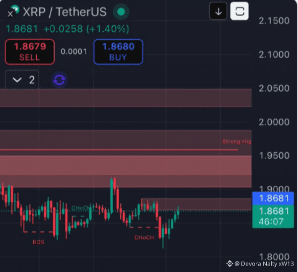 The resistance zone sits just below $2, a level that previously acted as a strong high. The asset earlier failed there, then pulled back into a tighter range. According to the chart, XRP continues to respect higher lows after a recent downside sweep. This type of behavior often signals accumulation.