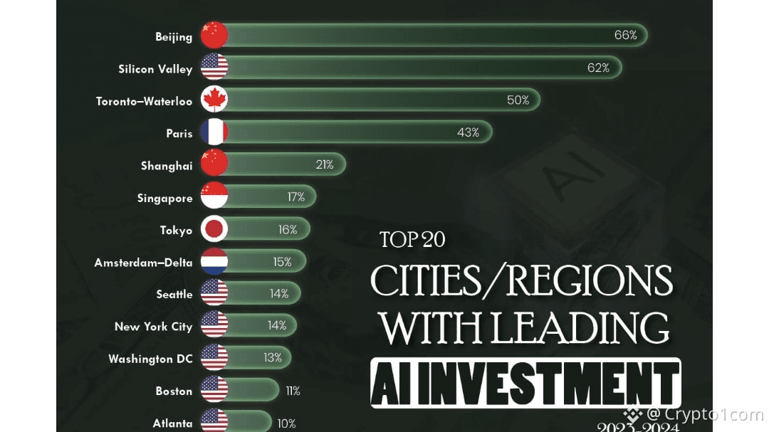 The United States remains the world’s most powerful AI innovation center. In the AI first-movers ranking, Silicon Valley ranks second globally, with 62.4% of its startup funding going into AI—just slightly behind Beijing. The U.S. also has several other cities in the global top 20, including Seattle, New York City, Washington DC, Boston, Atlanta, and Los Angeles.