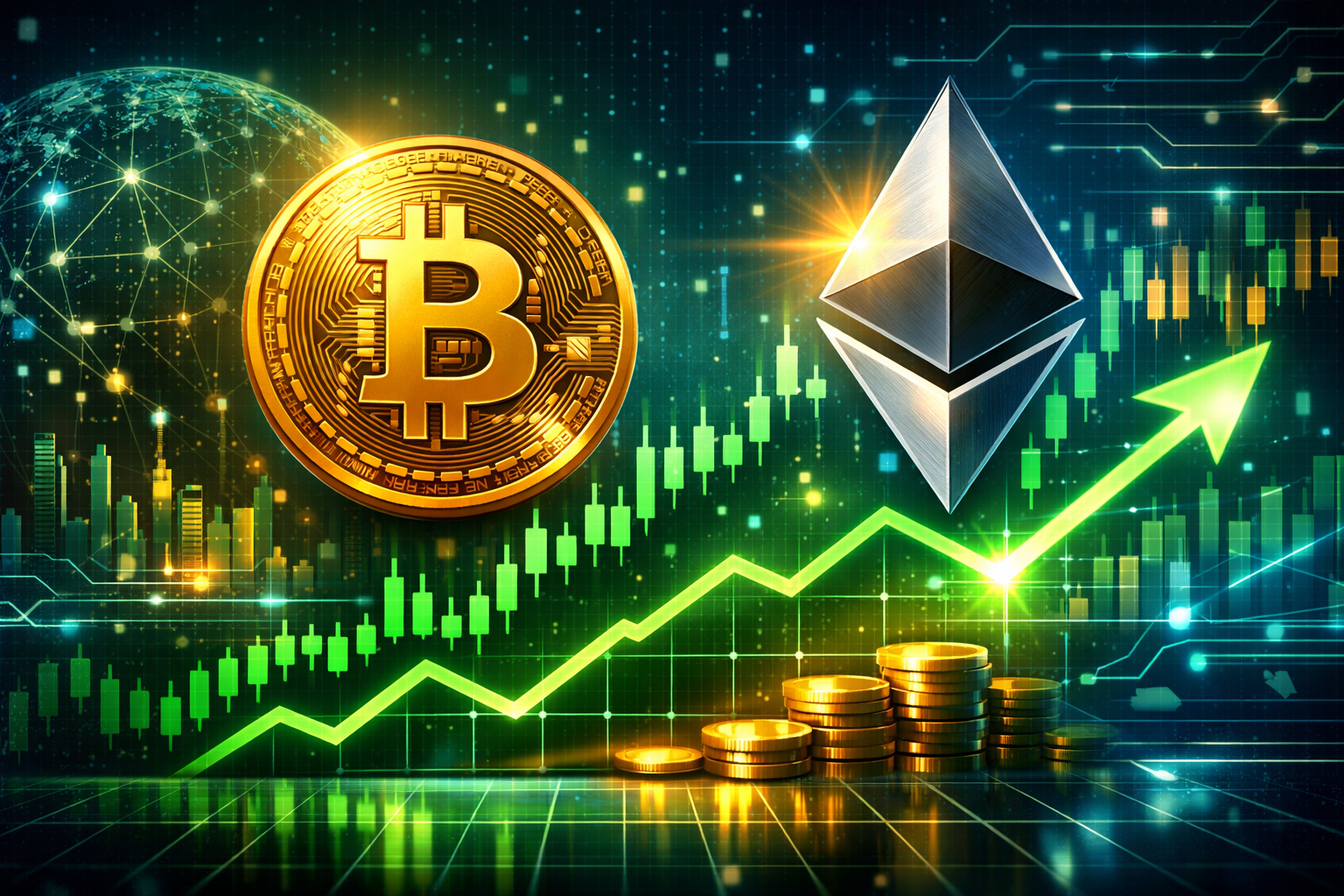 Eine moderne Darstellung des Kryptomarktes mit aufsteigenden Bitcoin- und Ethereum-Logos auf einem digitalen Chart, grüne Kerzen, leuchtendem Blockchain-Hintergrund und einem globalen Finanzthema.#BTC90kChristmas #StrategyBTCPurchase #CPIWatch #BTCVSGOLD #Token2049Singapore