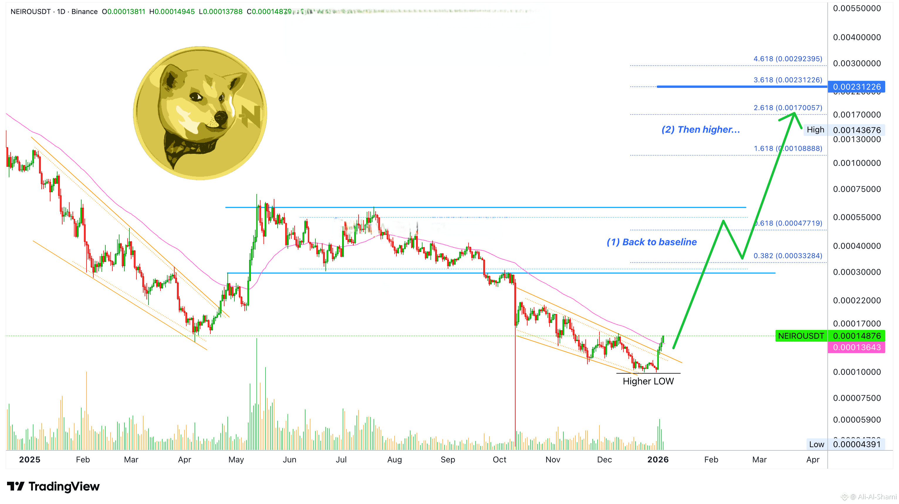 وصل NEIRO إلى أدنى مستوى له في أكتوبر 2025 وأنتج مؤخرًا أدنى مستوى أعلى، ديسمبر 2025. هذا الأدنى الأعلى هو الآن نقطة اللاعودة. ثم، انظر كيف أغلقت الحركة أمس فوق EMA55. انظر كيف تتحول الحركة إلى صعود كامل اليوم.