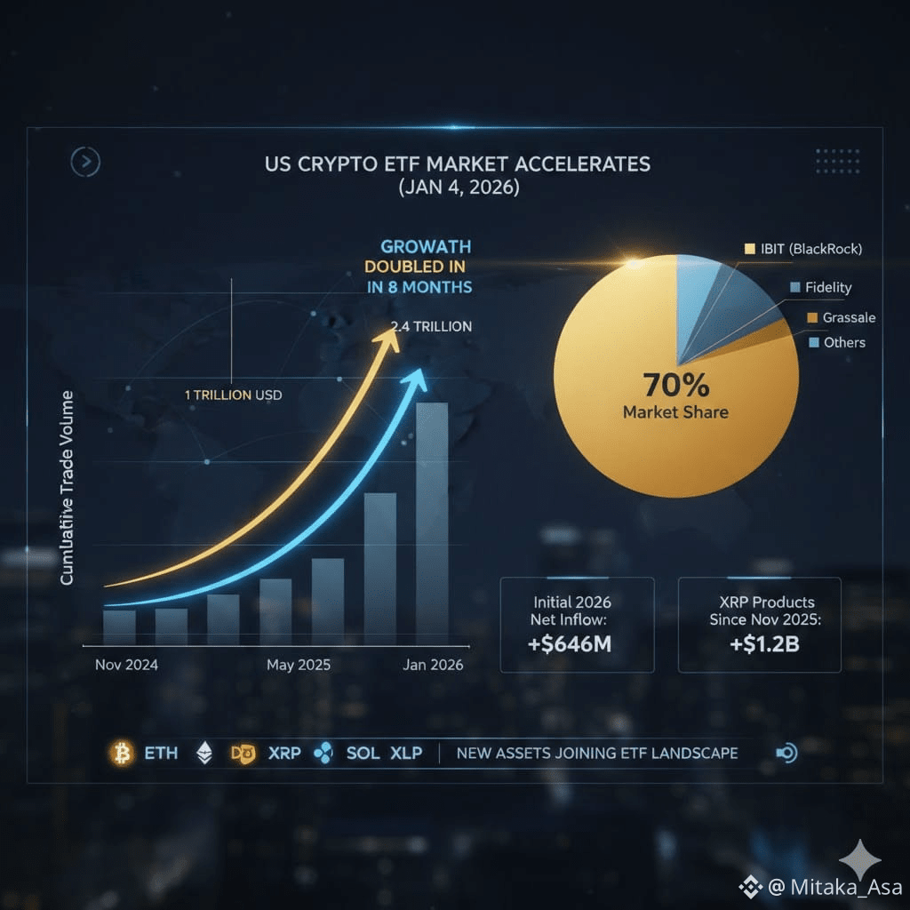 $ETH 截至2026年1月4日,美國現貨加密貨幣ETF的交易量已超過2.4萬億美元,僅在8個月內便從1萬億美元翻倍。比特幣和以太坊ETF合計淨流入資金達6.46億美元,其中貝萊德的IBIT佔據約70%的市場份額。交易量依然強勁,新資產如SOL和XRP亦已加入。自2024年11月推出以來,與XRP相關的產品已吸引12億美元資金流入。