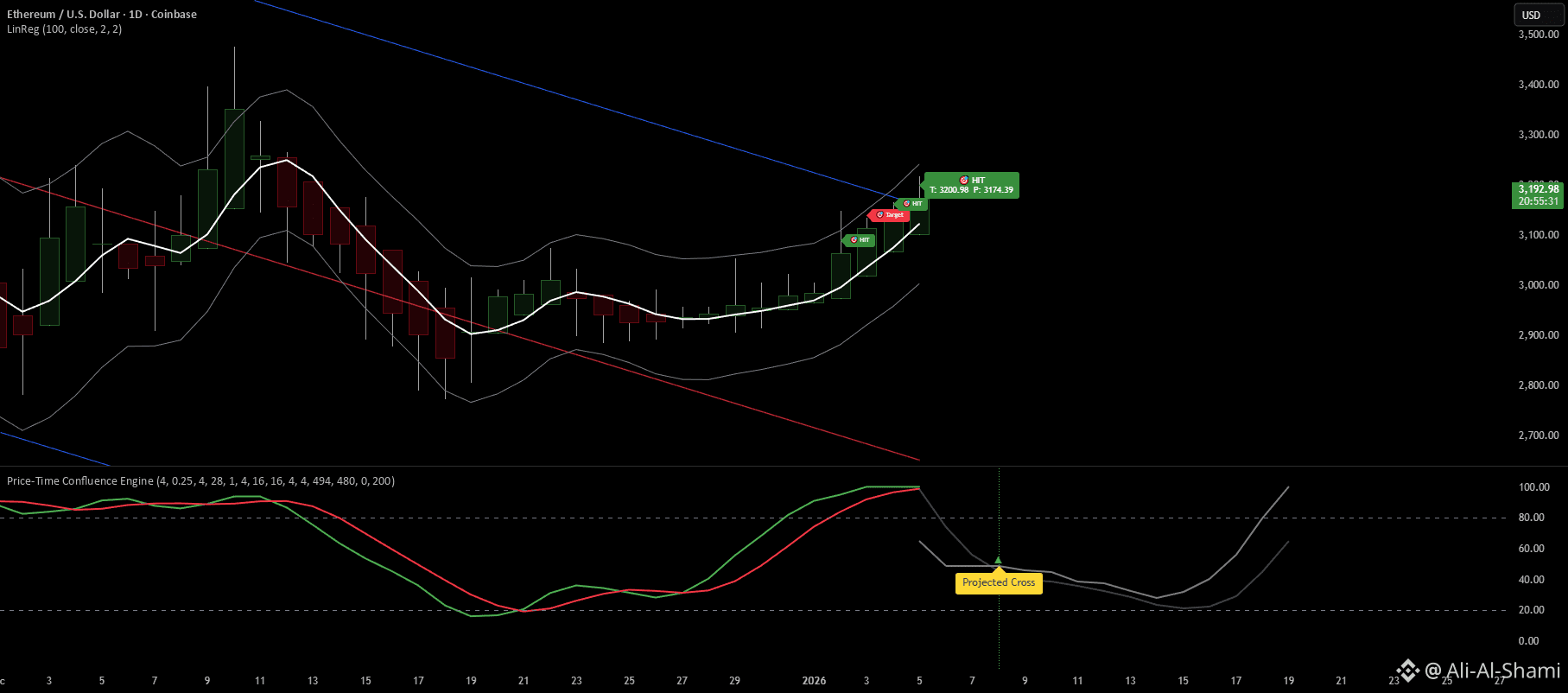 تقدم هذه الرسم البياني تحليلاً سياقيًا للإيثريوم (ETH/USD) على الإطار الزمني اليومي، مع التركيز على كيفية تفاعل هيكل السعر، ومستويات المرجعية المعتمدة على التقلب، وسلوك الزخم حاليًا.