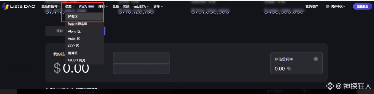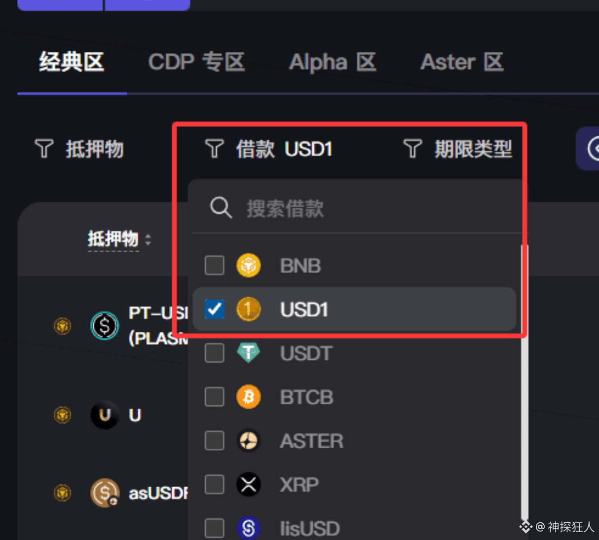 然后点击借款,选择经典区的USD1
