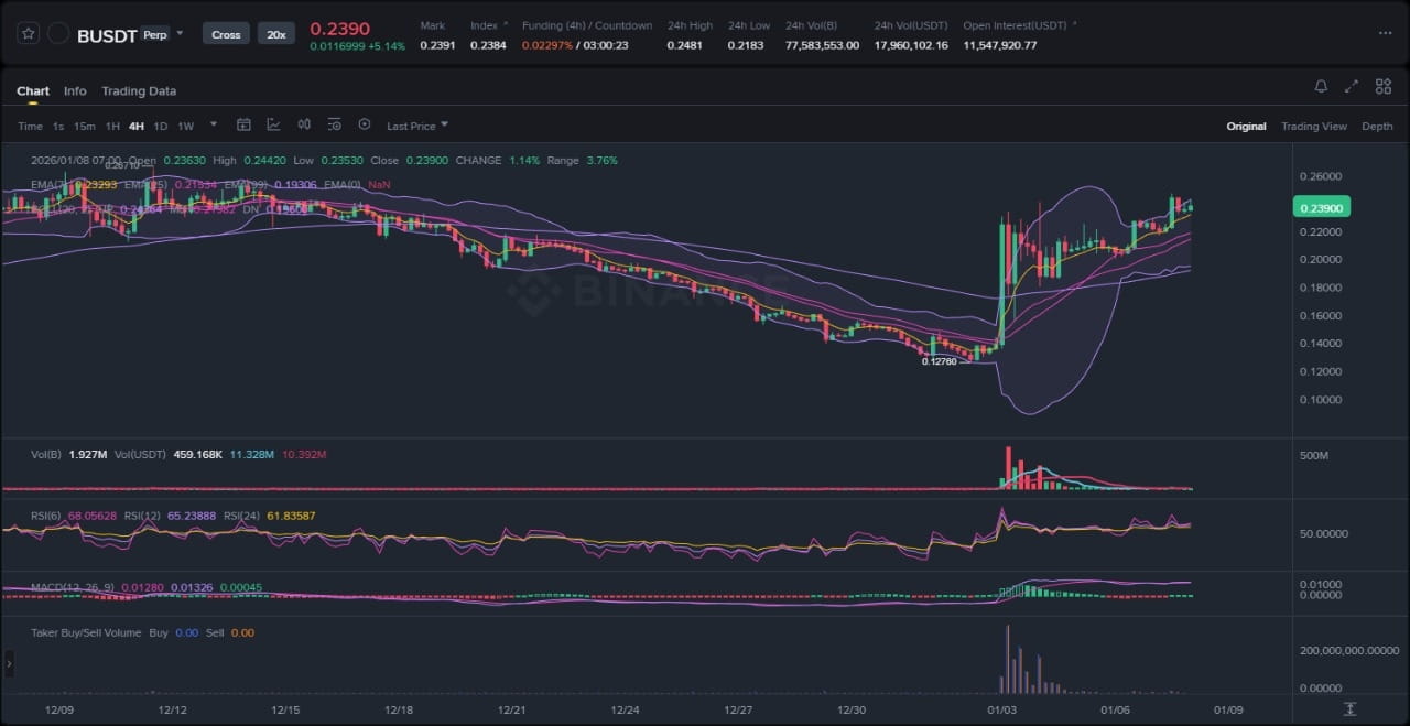 In Zukunft würde die Fortsetzung des Aufwärtstrends von B erfordern, dass der Kurs über der Unterstützung bei 0,71 $ bleibt und sich dem jüngsten Hoch annähert, idealerweise mit steigendem Volumen, um institutionelle oder privatsphärische Überzeugung zu bestätigen – ein Versagen hier könnte auf einen Fakesout in eine Konsolidierung hindeuten. Ein alternativer Szenario wäre die Aufhebung, falls der Kurs unter die 25-EMA nahe 0,68 $ bricht, was möglicherweise zu einem Absturz in Richtung der 99-EMA bei etwa 0,60 $ führen könnte, wo tiefere Liquiditäts-Pockets den Verkauf absorbieren könnten, bevor ein Rückgang erfolgt. Im Kontext eines Fakesouts könnte ein schnelles Ablehnen an der oberen Bollinger-Band gefolgt von einem Liquiditäts-Sweep unter 0,71 $ frühe Bullen fangen und eine Verteilungsphase auslösen, obwohl die aktuelle Dynamik dies ohne umfassende Marktkapitulation unwahrscheinlich macht.