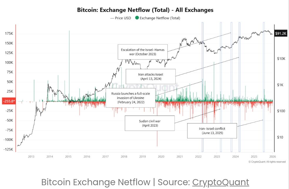 Allerdings erzählte die on-chain-Daten eine ruhigere Geschichte. Die Exchange-Nettoflüsse, die erfassen, ob Coins auf Börsen transferiert werden, um verkauft zu werden, oder abgezogen werden, um gehalten zu werden, verschlechterten sich während jener Ereignisse selten nachhaltig. Seit 2023 hat sich die Marktsituation zunehmend dazu entwickelt, lokale geopolitische Schocks zu absorbieren, ohne dass es zu einer weitverbreiteten Liquidation kommt.