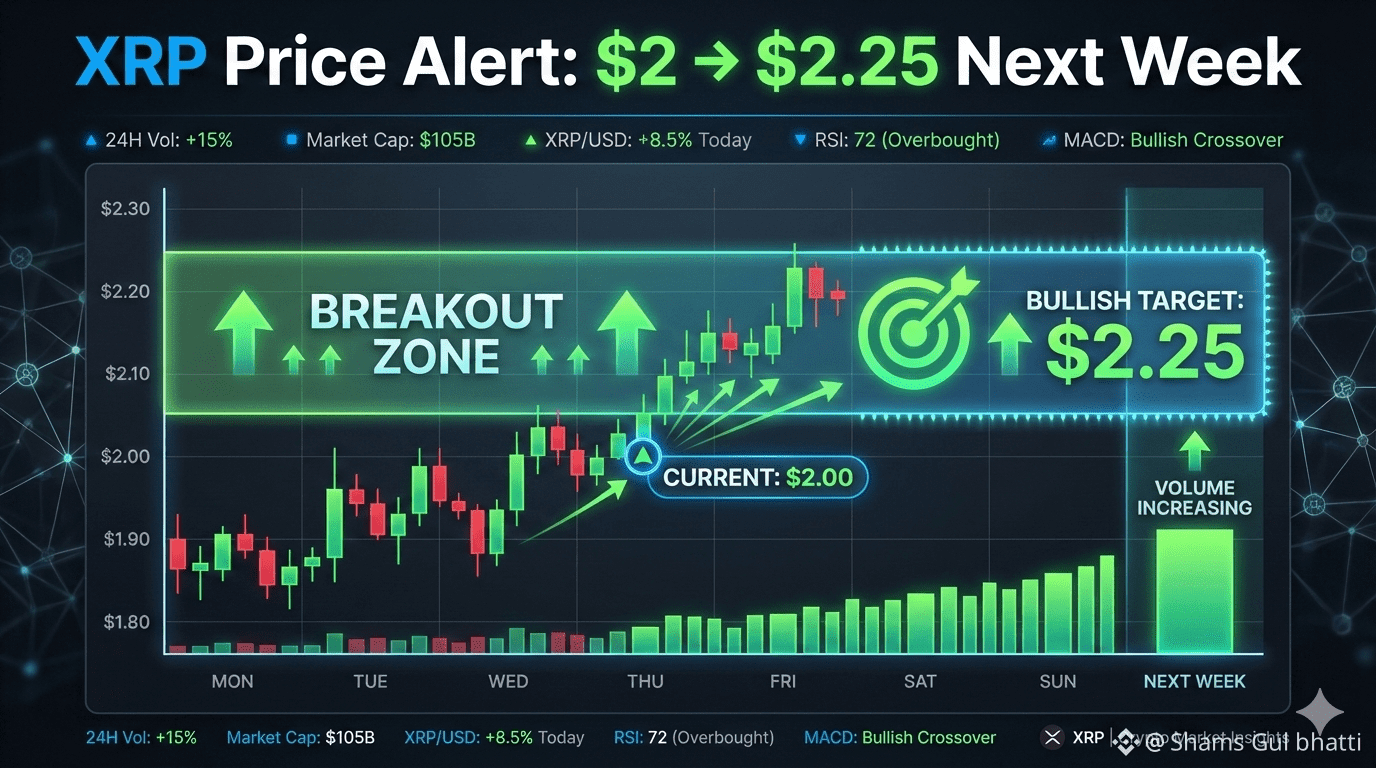 $XRP is currently trading around the $2 level and showing clear signs of bullish momentum. After a period of consolidation, buying pressure has started to build, signaling a potential short-term breakout. Market analysts are now forecasting a possible move toward $2.25 in the coming week, provided that momentum continues and overall market sentiment remains supportive.