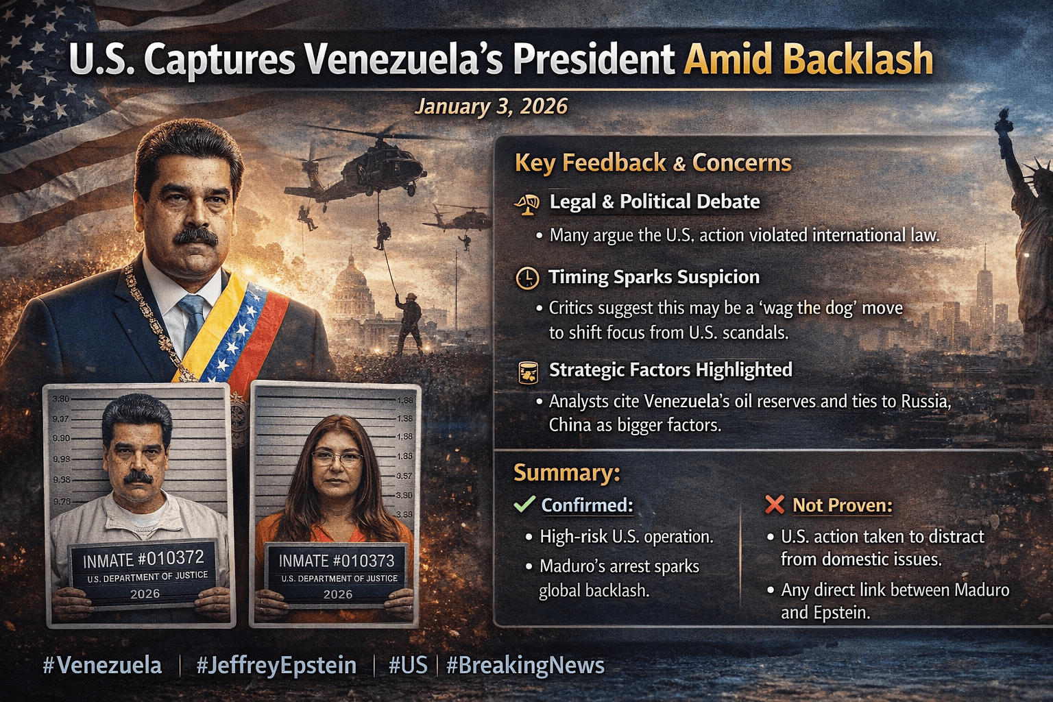 Allerdings ist es wichtig, klarzustellen: Es gibt keine nachgewiesenen Beweise dafür, dass die Aktion in Venezuela darauf abzielte, einen inneren Skandal zu verbergen oder zu ersticken. Diese Behauptungen basieren auf der zeitlichen Übereinstimmung und Verdacht, nicht auf bestätigten Fakten. Auch gibt es keine bestätigten Verbindungen zwischen Nicolás Maduro und Jeffrey Epstein.