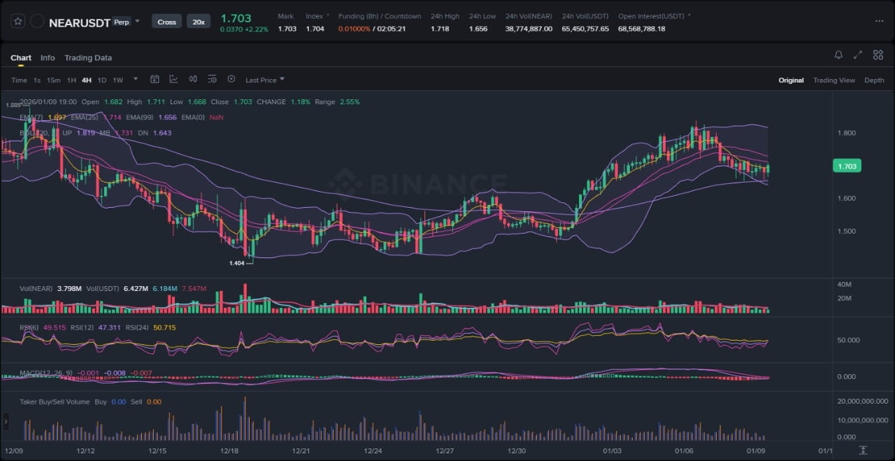 Bei der Betrachtung des angehängten Charts zeigt die Preisaktion von NEAR eine Aufwärtstrendstruktur, die versucht, aus einer mehrwöchigen Bandbreite auszubrechen, gekennzeichnet durch höhere Tiefs seit Mitte Dezember und eine Reihe impulsiver Bewegungen nach oben. Die Kerzenformation zeigt eine klare Konsolidierung in der Nähe der $1.70-$1.80-Bandbreite, mit einer kürzlichen Ablehnung bei einem lokalen Swing-Hoch um $1.80, gefolgt von einem Retest der Unterstützung, was auf einen Aufbau von Dynamik ohne Überdehnung hinweist. Beobachtbare Elemente umfassen die Expansion der Volatilität auf der Oberseite in den letzten 72 Stunden, wie durch sich erweiternde Bollinger-Bänder belegt, und einen Ablehnungshaken am unteren Band, der festgehalten hat und einen tieferen Rückzug verhinderte.
