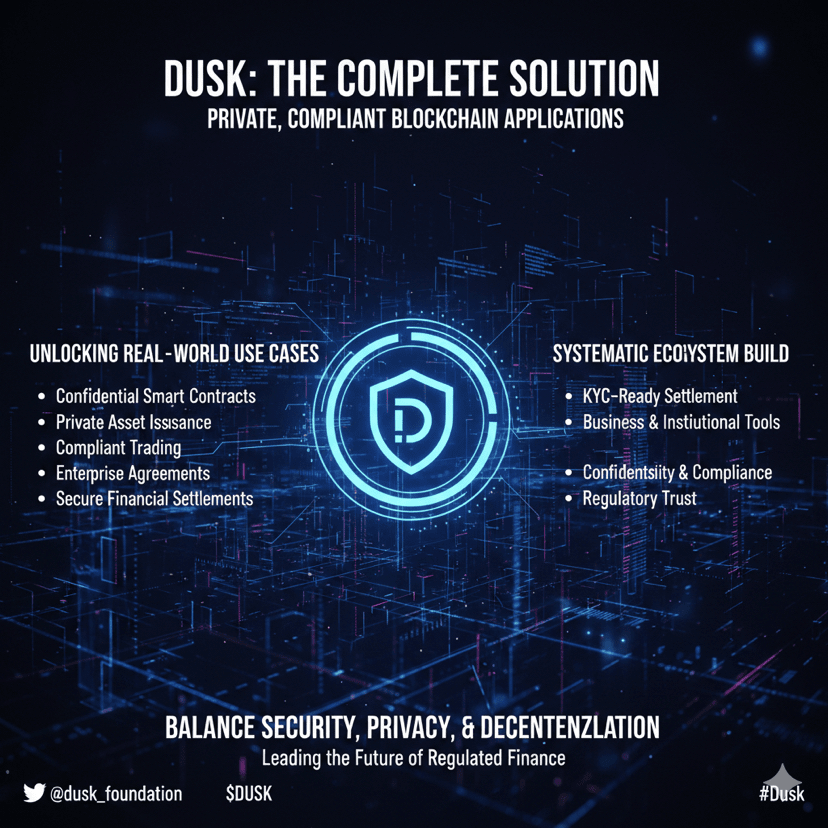 Jeder Zyklus bringt neue Geschichten mit sich, aber nur wenige Projekte konzentrieren sich auf den Aufbau von Infrastruktur, die echte Probleme löst. @dusk_foundation hebt sich durch seine gesamte Mission hervor, die darauf abzielt, die Blockchain für Branchen nutzbar zu machen, die Datenschutz und Compliance erfordern. $DUSK ermöglicht vertrauliche Smart Contracts, die sensible Logik schützen, während die Richtigkeit dennoch on-chain nachgewiesen werden kann. Dieser Ansatz eröffnet Anwendungsfälle wie die private Ausgabe von Vermögenswerten, kompatible Handelsprozesse, Unternehmensverträge und sichere Finanzabwicklungen – Bereiche, in denen Datenschutz keine Option, sondern eine zwingende Voraussetzung ist.