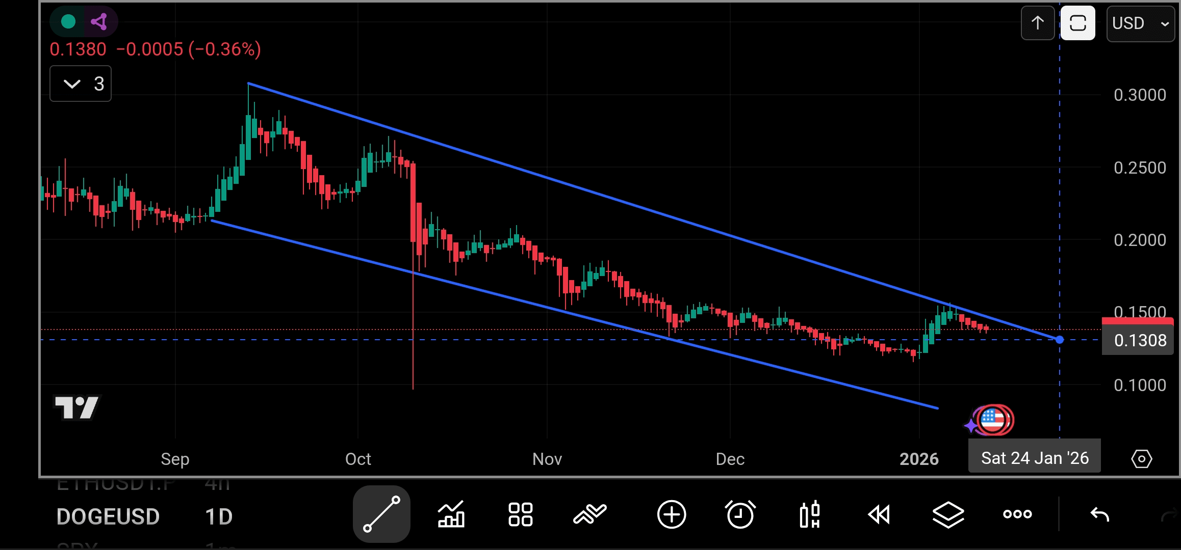 DOGE startete 2026 mit einem Anstieg, stieg über 30 % auf ein lokales Hoch von 0,1533 USD in der ersten Januarwoche, angetrieben von Rallyes bei Meme-Coin und technischen Indikatoren wie einem kurzfristigen Golden Cross (50-Tage-MA über 200-Tage-MA). Seitdem hat sich DOGE jedoch zurückgezogen und stieß an wichtige Widerstandsniveaus um 0,15 USD, was zu einem Rückgang bis zu den Unterstützungen bei 0,13 USD führte. Diese Konsolidierung folgt einer rauen Abwärtsbewegung Ende 2025, bei der DOGE einen Großteil seiner Gewinne verlor, doch die jüngsten Durchbrüche über die 50-Tage-Moving-Average deuten auf einen möglichen frühen bullischen Umkehrsignal hin. Technisch zeigt sich ein überverkaufter Zustand (RSI nahe 40), was auf eine Erholung hindeutet, doch bärische Bedrohungen bleiben bestehen, wobei mögliche Tests bei 0,12 USD oder sogar 0,10 USD erfolgen könnten, falls die Unterstützung versagt.