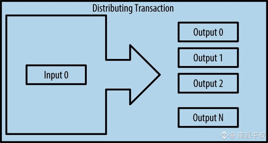 最后,另一种在比特币账簿中常见的交易形式是将一个输入分配给多个输出,即多个接收者(如图2-7)的交易。这类交易有时被商业实体用作分配资金,例如给多个雇员发工资的情形。