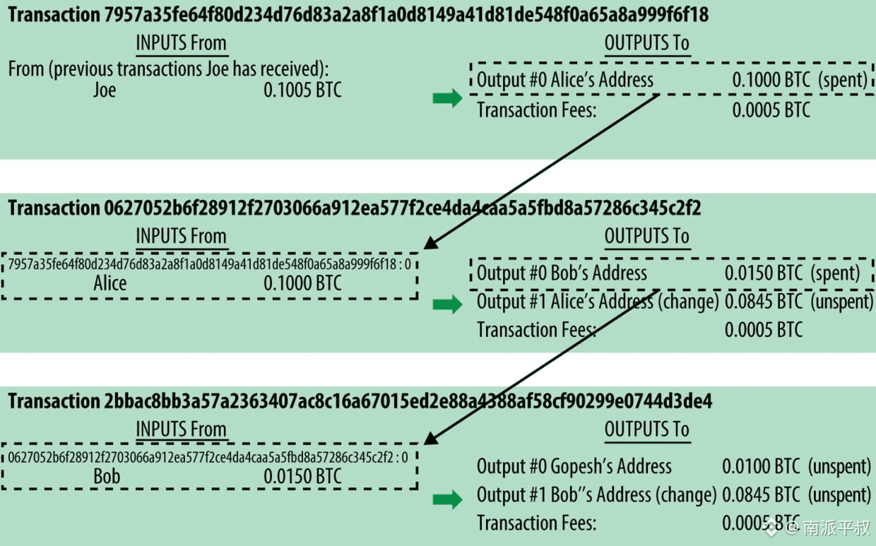 许多比特币交易都会包括新所有者的地址(买方地址)和当前所有者的地址(称为找零地址)的输出。这是因为交易输入,就像纸币那样能够,不能再分割。如果您在商店购买了5美元的商品,但是使用20美元的美金来支付商品,您预计会收到15美元的找零。相同的概念适用于比特币交易输入。