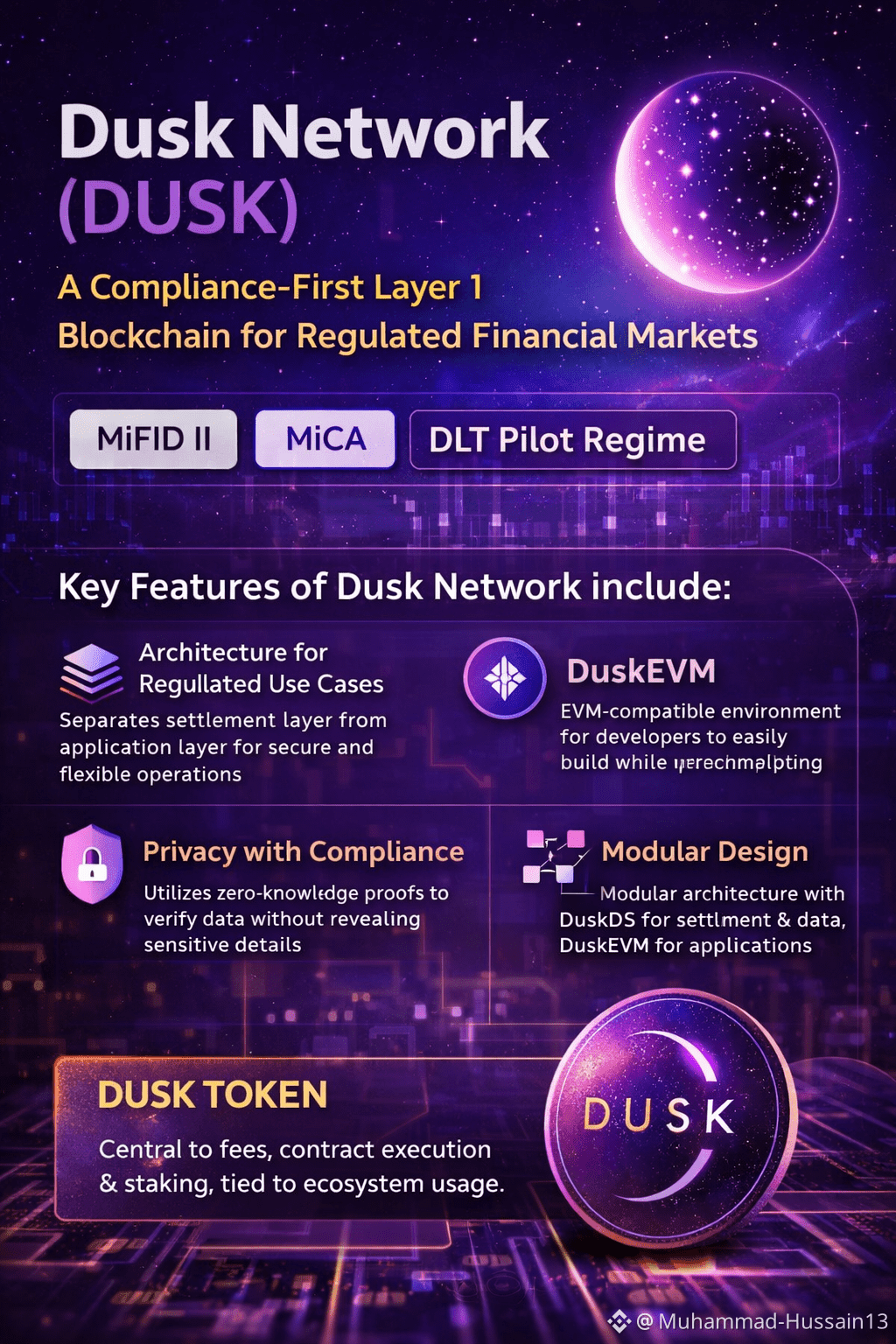 Dusk Network (DUSK) is a Layer 1 blockchain specifically designed for regulated financial markets. It aims to enable the issuance, trading, and settlement of real-world assets (RWAs) while complying with regulations like MiFID II, MiCA, and the DLT Pilot Regime.