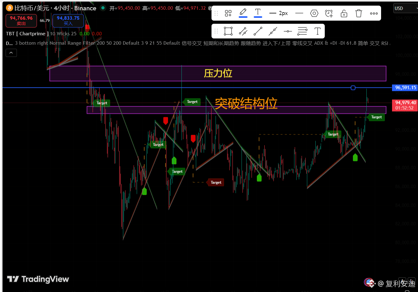 (实际配图替换为带标注的4小时K线图,标结构突破、压力位、支撑位、顶底转换)