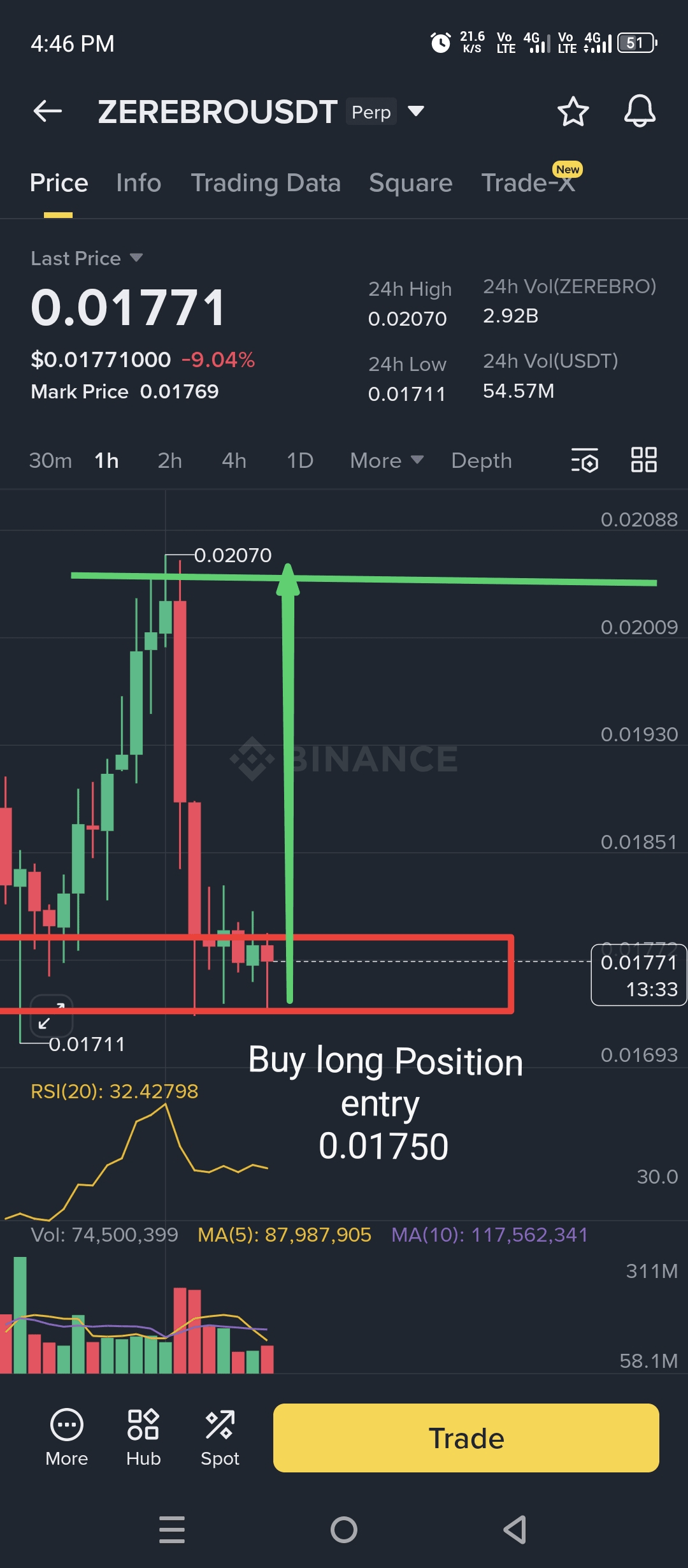 Das ZEREBRO/USDT-Diagramm zeigt eine Long-Position mit Einstieg bei 0,01750.