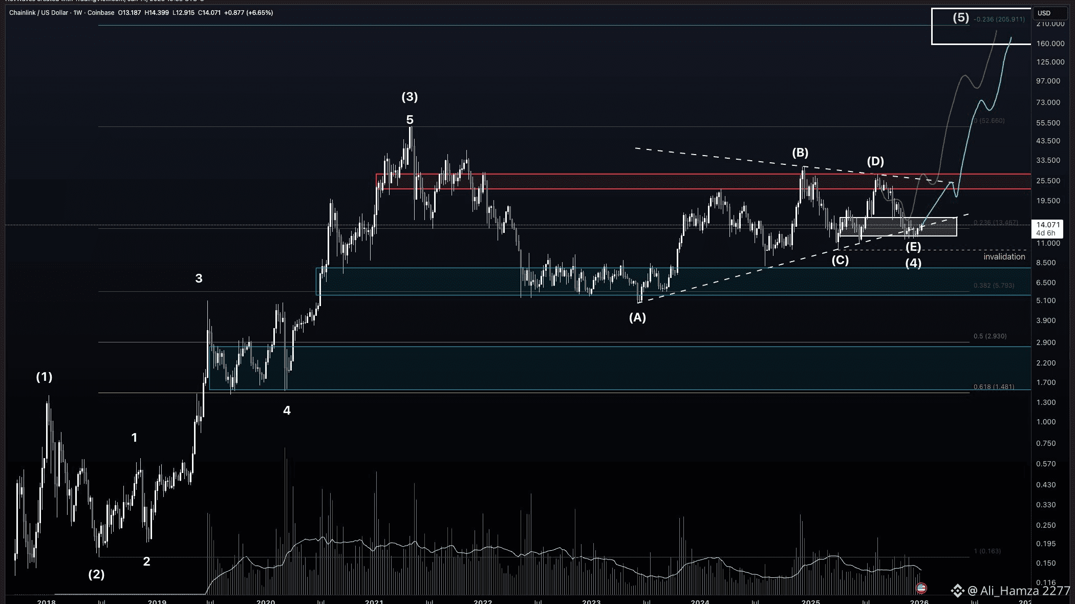 The Chainlink ($LINK /USD) weekly chart is displaying a high-timeframe Elliott Wave structure, forming a clear A-B-C-D-E triangle pattern. Price is currently trading along the ACE trendline, a critical compression zone that often precedes a major breakout.