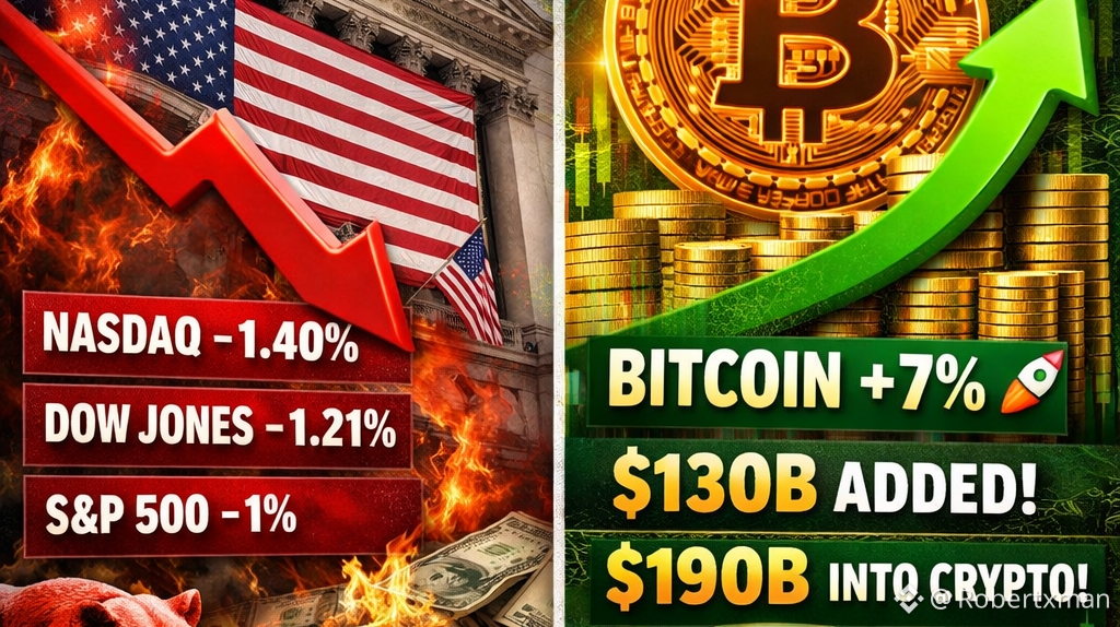 stieg um 7 %, wobei fast 130 Milliarden Dollar in die Marktkapitalisierung fließen, während der gesamte Kryptomarkt in nur wenigen Sitzungen um 190 Milliarden Dollar anwuchs. Dies ist keine zufällige Volatilität – es sieht aus wie ein klassisches Kapitalrotation, bei dem Liquidität aus überdehnten Aktien in hoch-beta, hochpotenzielle digitale Assets fließt.