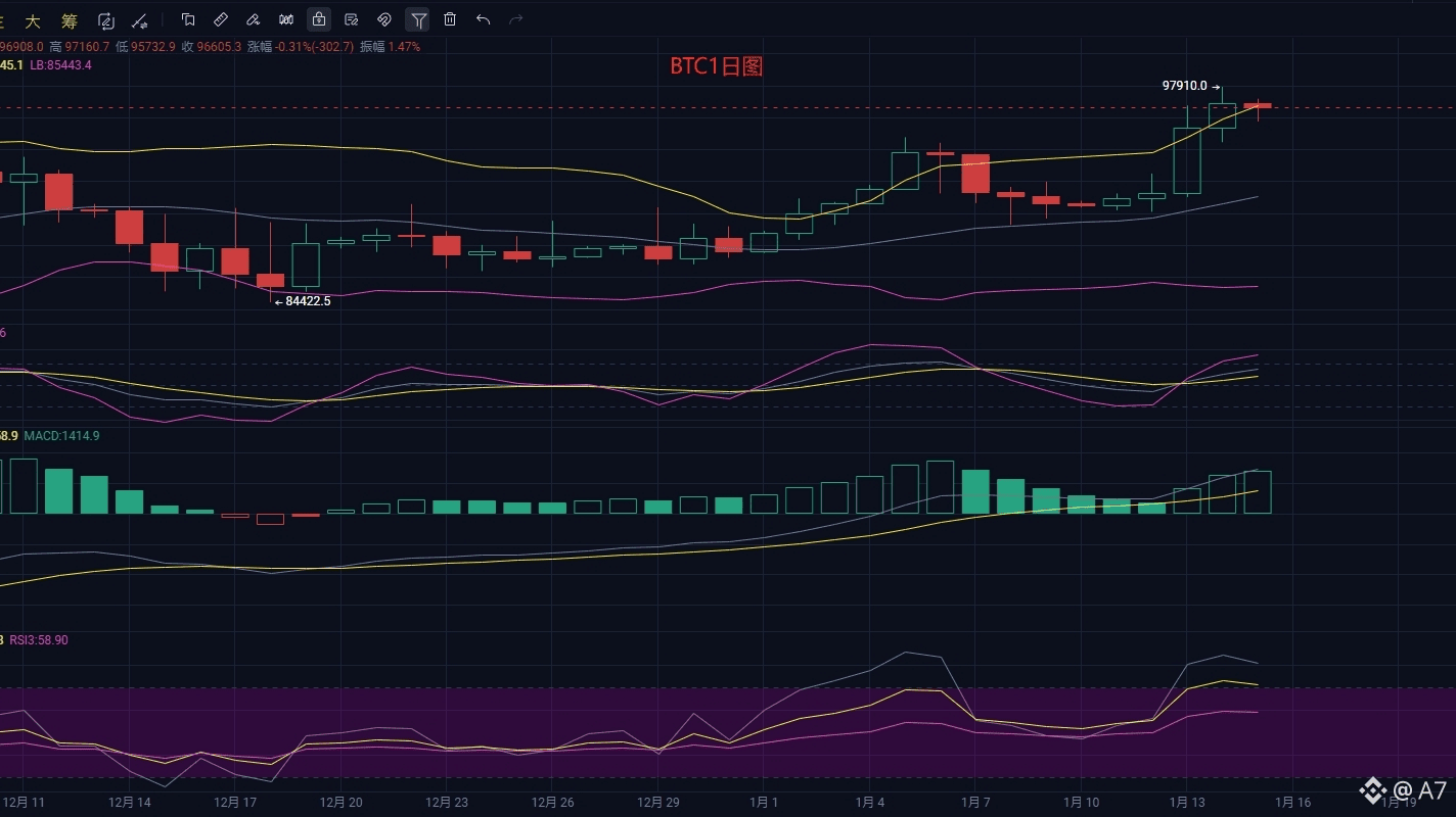 BTC profitiert von starker institutioneller Nachfrage und einer Verlangsamung der Inflation, Rekordzuflüsse in ETFs treiben eine kurzfristige Erholung an, und es bildet sich ein aufsteigender Kanal. Nach einem Test des Bereichs um 97900 Dollar fällt es zurück und bewegt sich im Tagesverlauf seitwärts. Sollte BTC die 98000 Dollar überschreiten, könnte das Ziel von 100000 Dollar wieder in Angriff genommen werden. Kurzfristig sollte BTC auf die Unterstützung bei 94000 Dollar achten; wenn diese nicht bricht, könnte man in der Nähe Long-Positionen in Betracht ziehen. Bei einem Bruch nach unten wird die 90000-Dollar-Marke ins Visier genommen, wo man mittelfristige Long-Positionen aufbauen kann; nach oben wird die 98000-Dollar-Marke beobachtet, die als Widerstand fungiert. ETH sollte kurzfristig auf die Unterstützung bei 3200 Dollar achten; wenn dieses Niveau hält, könnte man Long-Positionen in Betracht ziehen, während die 3400-Dollar-Marke als Widerstand dient. (Denken Sie daran, die Positionsgröße unter 10% zu halten)