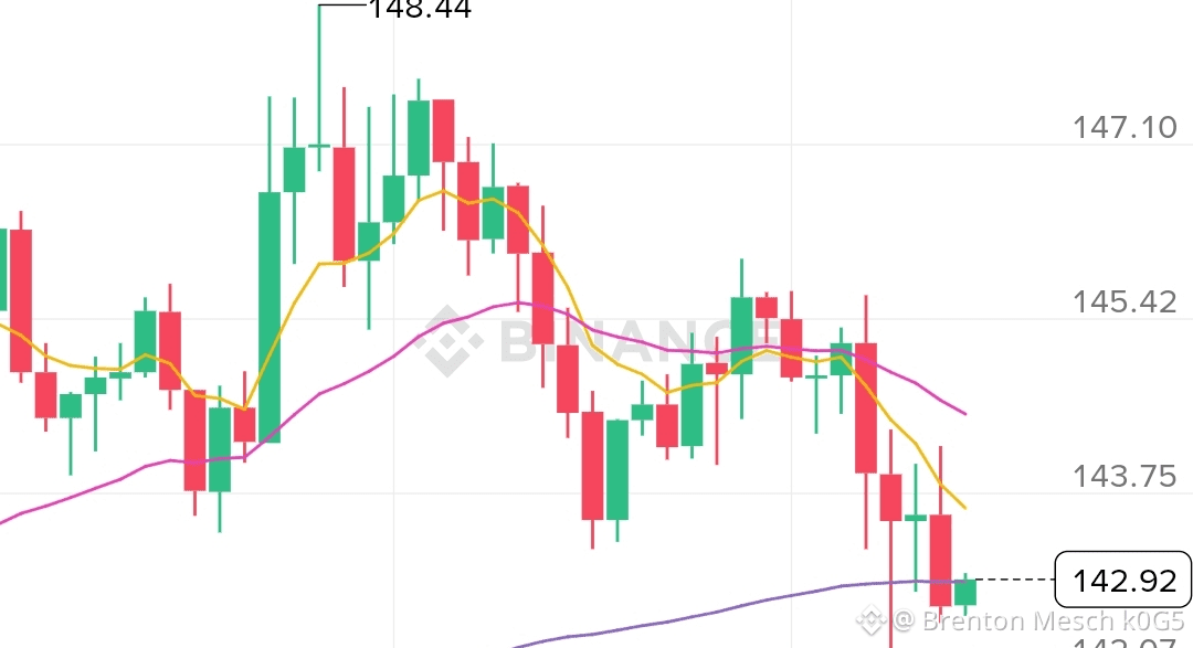 Preis nahe EMA(99) ≈ 142.9 (Schlüsselentscheidungsniveau)
