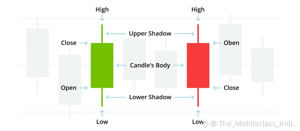 They display four prices: the opening price, the daily high and low prices, and the closing price. The thin lines (wick and fuse) represent the daily range from high to low. The wick is the upper thin line or upper shadow above the candle body, and the fuse is the lower thin line or lower shadow below the candle body. The broad part (candle body) measures the distance between the opening and closing prices. If the closing price is higher than the opening price, the candle body is green or white (positive); if it is lower, the color of the body is red or black (negative).