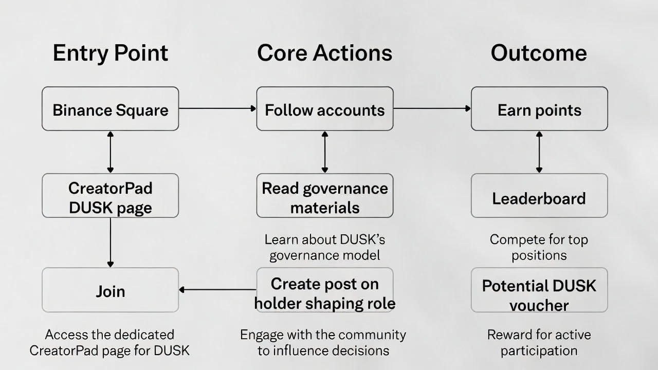 I landed on the CreatorPad page for DUSK after clicking through from Square. The main screen had sections like follow, post, engage – straightforward but with a bunch of small checkboxes. The "Governance Through Tokens" part linked to some articles and a prompt to reflect on how DUSK holders shape things.
