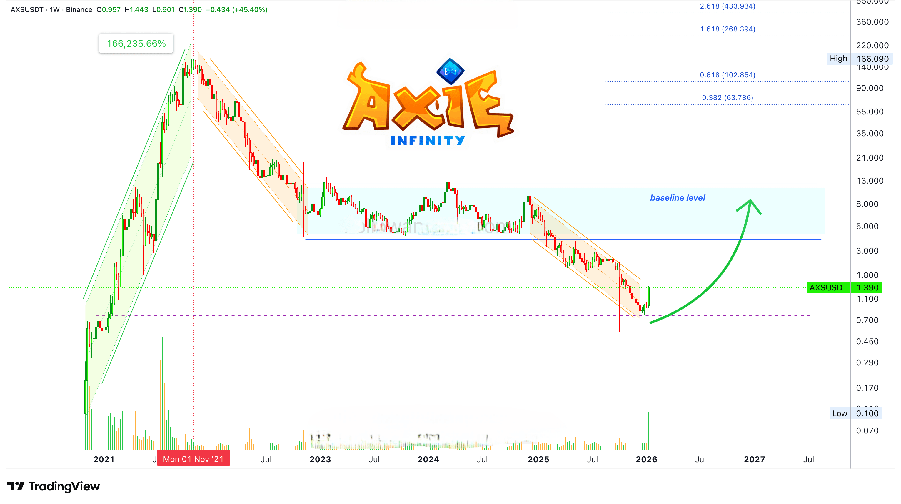 Nachdem Axie Infinity um beeindruckende 166.000% gewachsen ist, trat es in einen verlängerten Bärenmarkt ein; die bärische Bewegung begann im November 2021, wie es für viele Kryptowährungsprojekte der Fall ist.