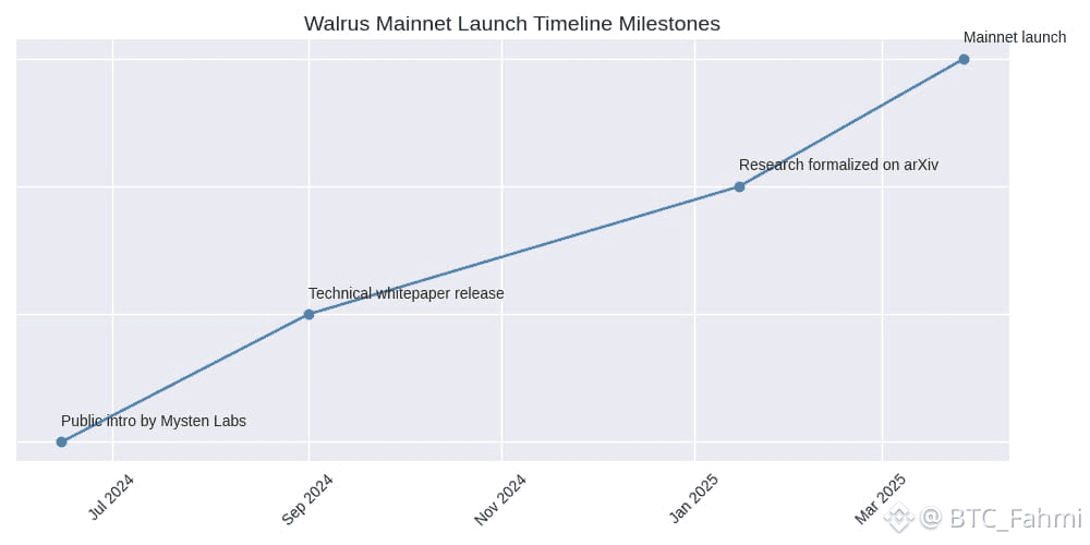 Für Investoren und Händler lag das Signal nicht im Branding – es lag im Timing und in der Ausführung. Walrus veröffentlichte sein technisches Whitepaper im September 2024, formalisiert zusätzliche Forschung auf arXiv im Jahr 2025 und startete sein Mainnet am 27. März 2025. Dies markierte den Übergang von theoretischen Speicheransprüchen zu einem Live-System, in dem Daten unter Produktionsbedingungen gespeichert und abgerufen werden.